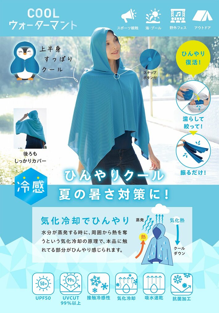 株式会社コジット(本社:大阪府大阪市、代表取締役:久保慎一郎)は、強い日差しと暑さが気になる季節に、水に濡らして絞り、軽く振るだけで冷たくなるフード付きのマント「COOLウォーターマント」を2026年3月2日(月)より全国発売します。
