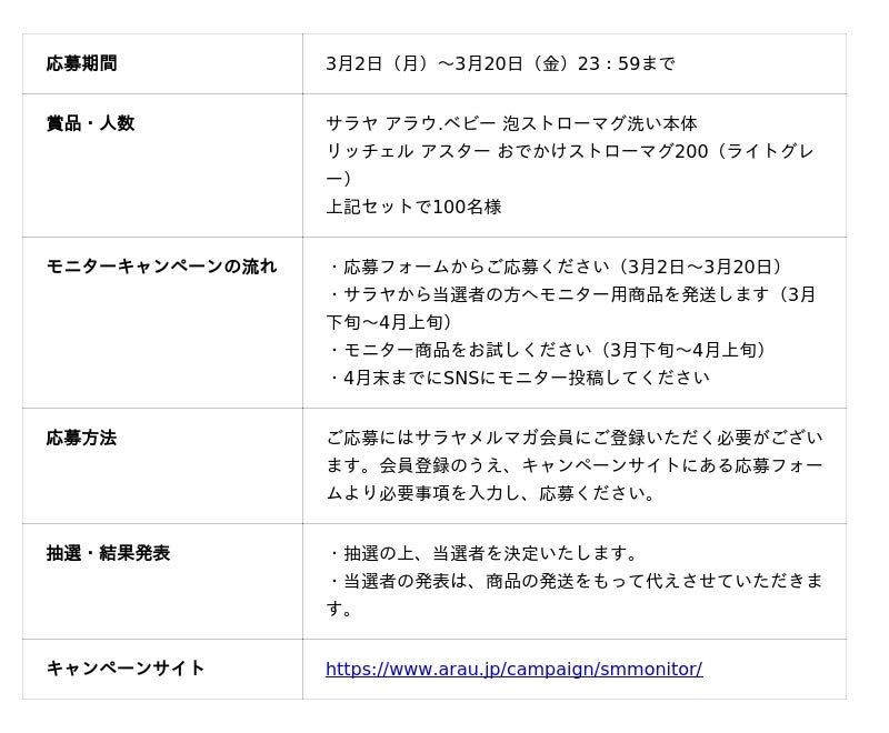 サラヤ株式会社(本社:大阪/代表取締役社長:更家悠介)は、「アラウ.ベビー 泡ストローマグ洗い」と「リッチェル ストローマグ」がセットで100名様に当たるモニターキャンペーンを2026年3月2日(月)から開始することをお知らせします。