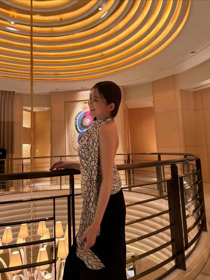 写真を見ると、ホテルのようなラグジュアリー感あふれる場所に足をクロスさせて立つ久間田さんの姿が!