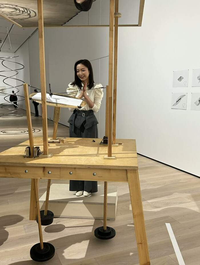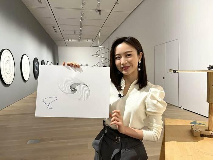 この展覧会でおすすめなのがエリアソンさんのスタジオのスタッフも使っているドローイングマシンを使った体験。佐久間アナもトライしてみました。