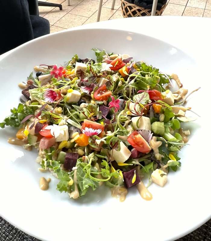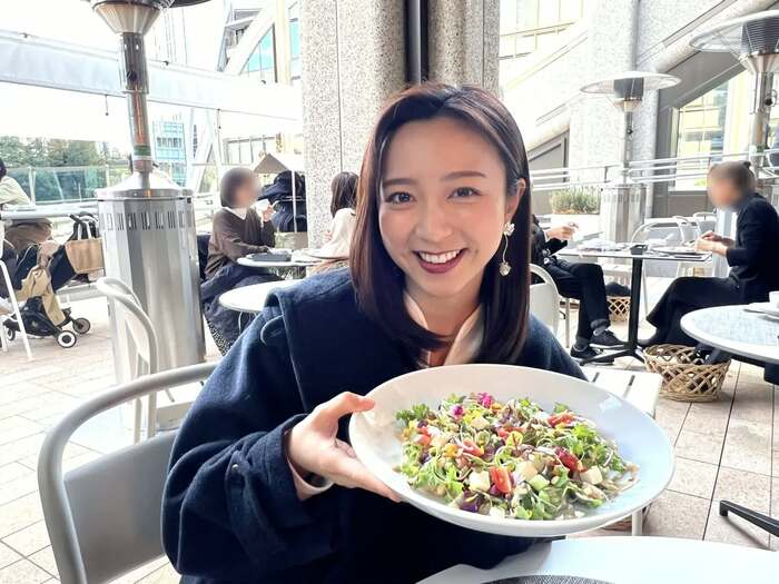 玄米の上にふんだんのオーガニック野菜が盛られた名物“ブッダボウル”。佐久間アナは「まるでたった今お花畑からつんできたようにフレッシュです!」と“目”で味わったあと、口にしてみると「いろいろなお野菜の味が次々として飽きないです」と笑顔。