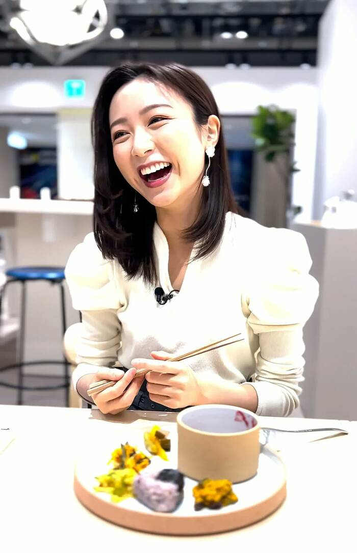 まずは「酒粕とヨーグルト、味噌のカボチャサラダ」から。Tokyo Art Vibes∞の収録ということで、佐久間アナは「ワオ!」という英語のリアクション。「酒粕の風味が効いていて、甘さ加減が絶妙」とのこと。次々と食していきますが、「どれも味も食感もサプライズがあって、それがとても楽しい!」とコメントしました。