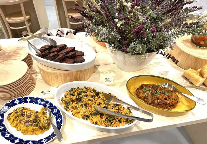 「食材は地産地消を心がけ、東京近郊で調達し、塩麹(こうじ)やお味噌などを使っています」と話す増谷さんは、エリアソンさんの哲学を反映させたメニューを開発しました。渾身のヴィーガン、ベジタリアン料理が並ぶビュッフェに、早速、佐久間アナの食リポタイムです!