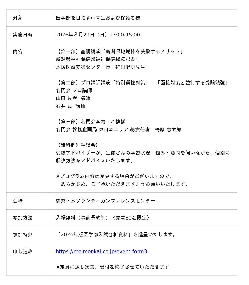 株式会社リソー教育グループ(本社:東京都豊島区、代表取締役:天坊真彦)の子会社である、株式会社名門会(本社:東京都豊島区、代表取締役:吉田信司)は、2026年3月29日(日)13時より、御茶ノ水ソラシティカンファレンスセンターにて「特別選抜・地域枠」徹底活用セミナーを開催いたします。自治体担当者による「医学部地域枠」の「求める人物像」と「合格のポイント」や、名門会プロ教師による「特別選抜入試の学科・面接対策」についての講演を行います。医学部進学を目指す中高生、保護者様はぜひご参加ください。