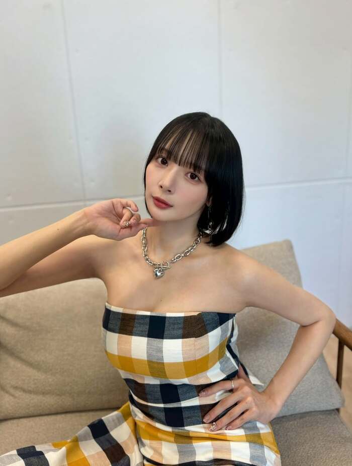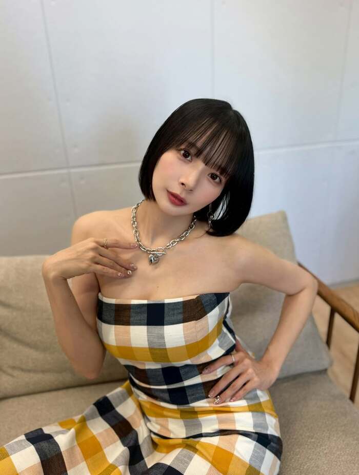 そこには、胸元が開いた白地にオレンジ、ネイビーのチェック柄の衣装に身を包んだ岡田さんが。