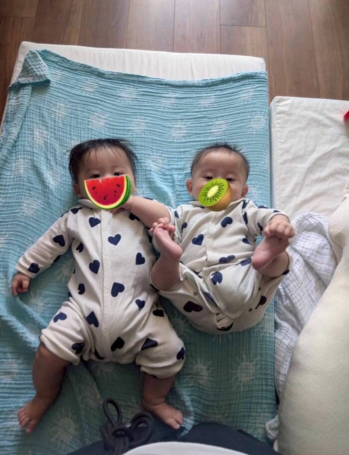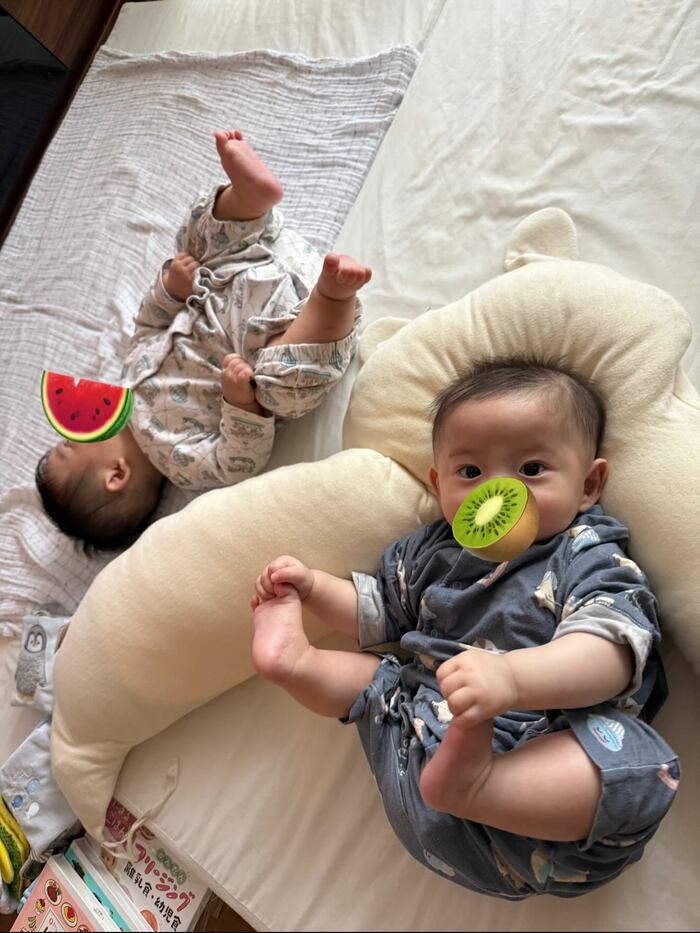今回の投稿では、「ふたごの保育園の準備と離乳食がいよいよ始まるのでドタバタ!」と報告し、双子の最新ショットを公開しています。