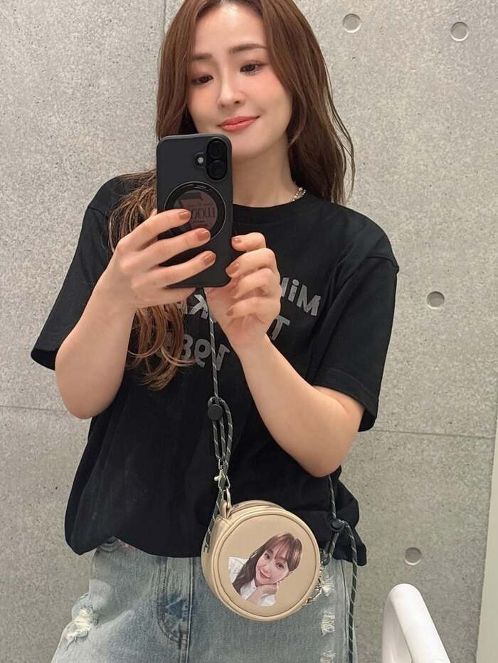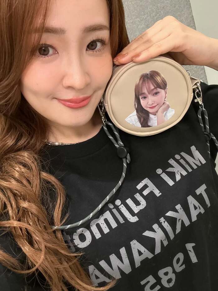 タレントの藤本美貴さんの顔がデザインされたベージュの丸バッグを掛けています!