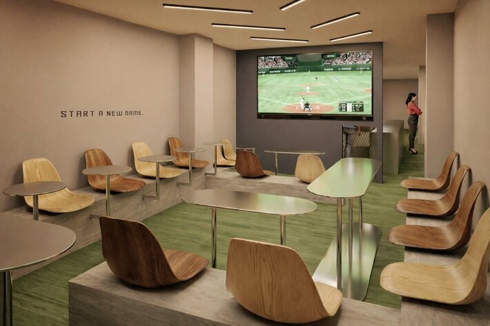 フィールドを想起させるフロアや、球場を意識した内装色、素材構成を採用し、長時間の観戦でも快適に過ごせる環境を整備。