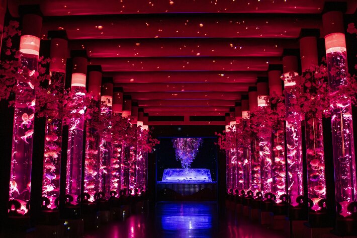 水が湧き出す泉を象徴した円柱水槽「金魚の湧泉」が佇む幻想的な空間。重なり合う桜の繊細なグラデーションとともに、クリスタルやミラーが光を優しく反射し、奥行きのある立体的な美しさが広がります。金魚、光、花が溶け合う、心奪われる“桜の没入空間”です。
