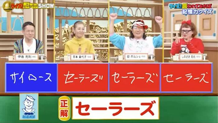 正解は「セーラーズ」。芳本さん、掟さん、しのざきさんの3人が正解。実は、よく見てみると掟さんが正解のブランドのトップスを着ていました!