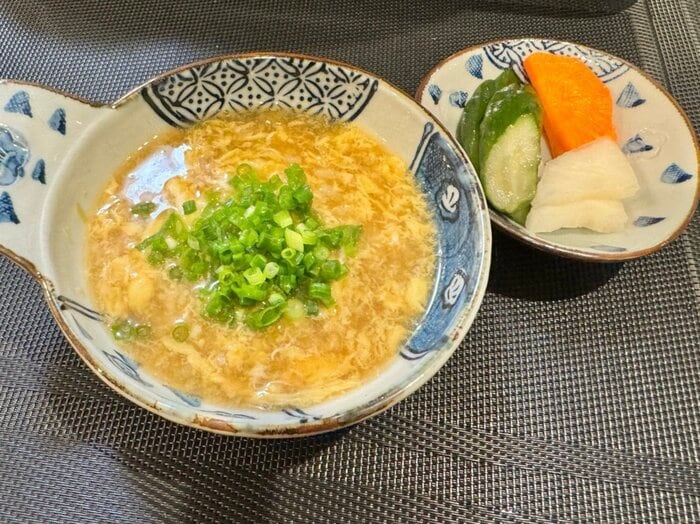 器によそわれた、とろりとした質感の卵スープのような雑炊には中央には刻みねぎがたっぷりと乗せられ、彩りも鮮やかです。添えられた人参やきゅうり、大根の漬物も美味しそうで、薬丸さんが「優勝」と称するのも納得の、旨味が凝縮された一品であることが伝わってきます。