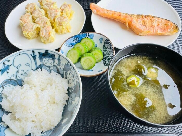 七福神が描かれた愛らしいお茶碗には、ふっくらとした白ご飯。黒いお椀には、オクラとワカメが入った味噌汁が注がれています。主役の焼き鮭は、こんがりと香ばしい焼き色がつき、思わず箸を伸ばしたくなる仕上がり。さらに、シュウマイも添えられ、しっかりと満足感のある献立となっています。