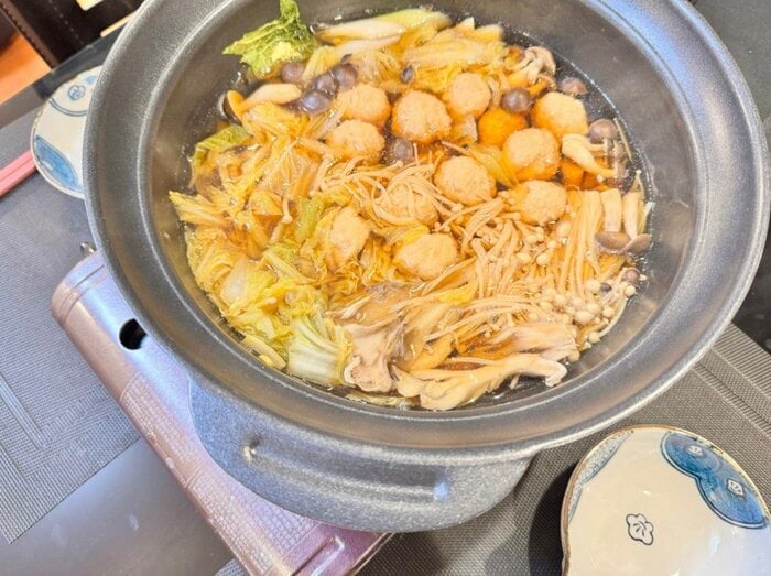 卓上コンロの上でぐつぐつと湯気を立てているのは、具材たっぷりの鍋料理。白菜やきのこに加え、比内地鶏で作ったつみれが贅沢に並び、だしの旨みが画面越しにも伝わってくるようです。素材の彩りも豊かで、見ているだけで体が温まりそうな一枚となっています。