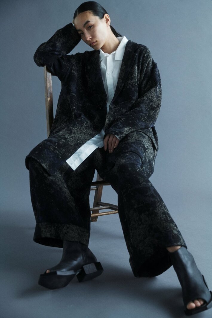 絨毯柄をジャカード織で表現した、アシンメトリージャケットとフロントタックパンツ。