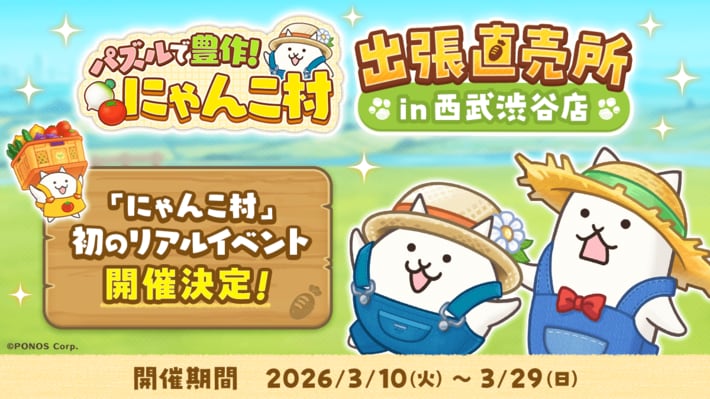 ポノス株式会社(本社:京都府京都市、代表取締役:辻子依旦、以下「ポノス」)は、2026年3月10日(火)から、「パズルで豊作!にゃんこ村 出張直売所 in 西武渋谷店」を開催いたします。