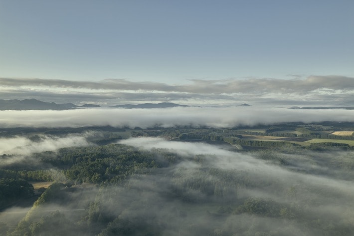 「Azuma Farm Koiwai」は、岩手県・小岩井農場の豊かな自然環境の中に誕生します。小岩井農場は、かつて火山灰に覆われ草木さえも育たなかった荒野が、130年以上の歳月を経て、多様な森へと再生された場所です。約3,000ヘクタールにも及ぶこの広大な森は、人が自然を開発するのではなく、自然とともに生きるという選択によって生まれました。創業当初より、小岩井農場では広葉樹中心の植林が行われ、今もなお森を育て続け、季節ごとの移ろいや多様な命を守り続けている稀有な場所です。その森の一角、約8ヘクタールの牧草地に「Azuma Farm Koiwai」は誕生します。24の客室、レストラン・ラウンジ、プライベートサウナなど、それぞれが独立した建物として、岩手山をのぞむ広大な自然の中に点在しています。