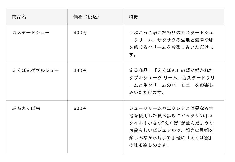 1. 老舗「のだ初」の卵を活かした生地と「うぶこっこ家」による監修シュークリームやエクレアの美味しさの土台となる生地には、うぶこっこ家の最高級卵「あっぱれ」を贅沢に使用しています。卵のポテンシャルを最大限に引き出すプロの技と素材が融合し、香ばしく風味豊かな仕上がりを実現しました。 ※一部のクリームや商品には、メニュー特性に合わせて厳選した最適な素材(卵を含む)を個別に組み合わせています。