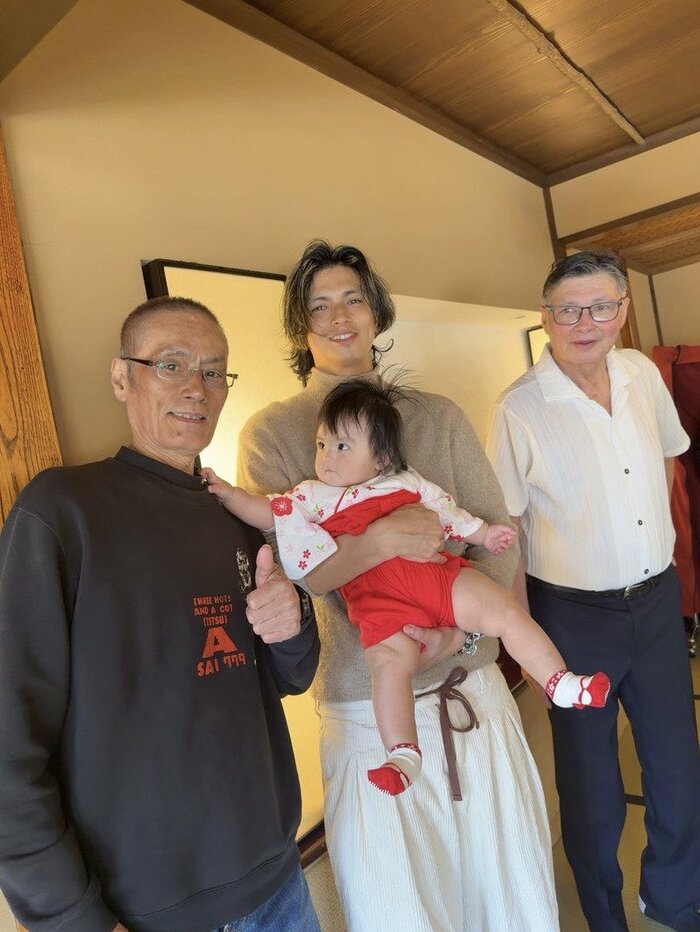 ググガガちゃんを抱っこするアレクサンダーさんの隣には川崎さんのお父さんと、アレクサンダーさんのお父さんが並びます。親指を立ててポーズをとる川崎さんのお父さん。そんなおじいちゃんの肩に手を伸ばすググガガちゃんは、初対面とは思えないほど人懐っこい姿も見せています。