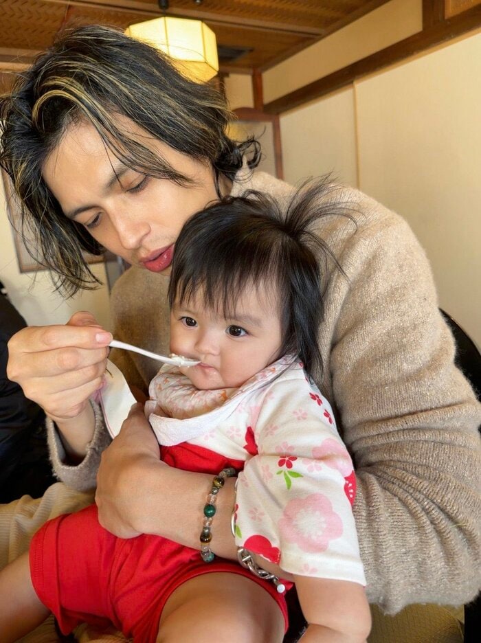 アレクサンダーさんが、ググガガちゃんを膝の上に抱き、スプーンで優しくお豆腐を食べさせている微笑ましい瞬間が収められています。アレクサンダーさんの愛情のこもった眼差しと、小さく口を開けて食べさせてもらうググガガちゃんの姿から、父と娘の心温まるひとときが伝わってきます。