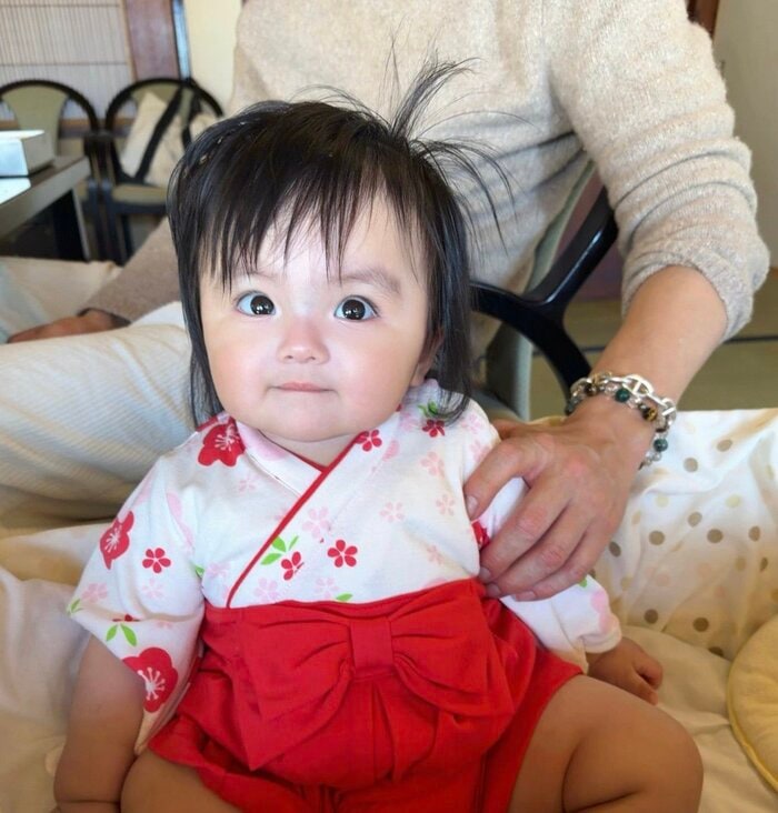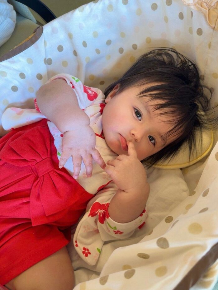 白地に赤い花柄があしらわれたトップスに、赤い帯をきゅっと結んだ袴風の和装ロンパース姿。ドット柄の布団の上に横たわり、くりくりとした大きな瞳でカメラをまっすぐ見つめる様子は、思わず頬がゆるんでしまう愛らしさです。