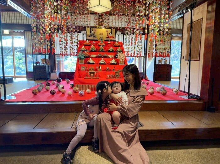 公開された写真には、華やかな七段飾りのひな壇を背景に、川崎さんが次女・ググガガちゃんを優しく抱きかかえる姿が収められています。天井からは色とりどりの房飾りが揺れ、お祝いムードをいっそう華やかに演出。その隣では、"美人ちゃん"が妹の頬にそっとキスをする微笑ましい場面も写っており、姉妹の愛らしいやりとりが伝わってきます。