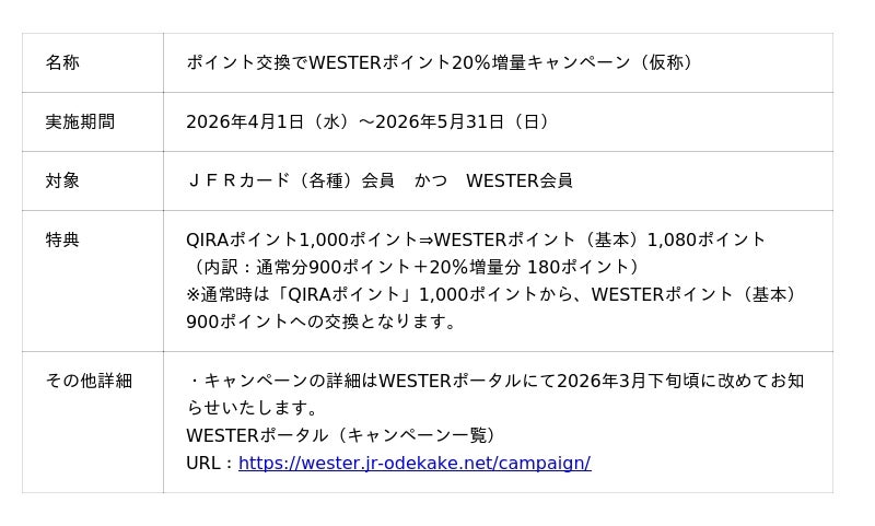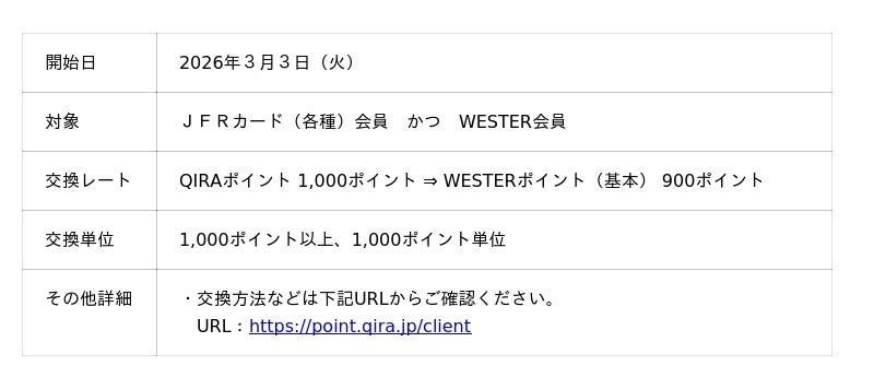 西日本旅客鉄道株式会社(本社:大阪府大阪市、代表取締役社長:倉坂昇治、以下「JR西日本」)は、JFRカード株式会社(本社:大阪府高槻市、代表取締役社長:大木淳史、以下「JFRカード」)が提供する「QIRAポイント」から「WESTERポイント」への交換サービスを2026年3月3日(火)より開始いたします。