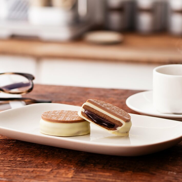 ローストの香ばしい香りとともにまろやかなコクを感じる、とろけるヘーゼルナッツキャラメルをホワイトチョコレートで包み、カカオの奥深い香りを引き立てた繊細で軽やかな食感のココアクッキーでサンドしました。