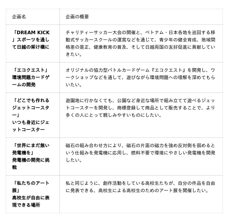 無限の夢を燃料にして「突き抜ける人」を目指す。「サッカーを通してベトナムとの懸け橋になりたい」「環境にやさしい新しい発電機を開発してみたい」…など今年度も様々な本気の夢を持つ生徒たちが、夢の具現化を目指してオーディションにぶつかります。高校の学習枠を超えた、斬新な取り組みです。下記日程で最終審査会を行います。