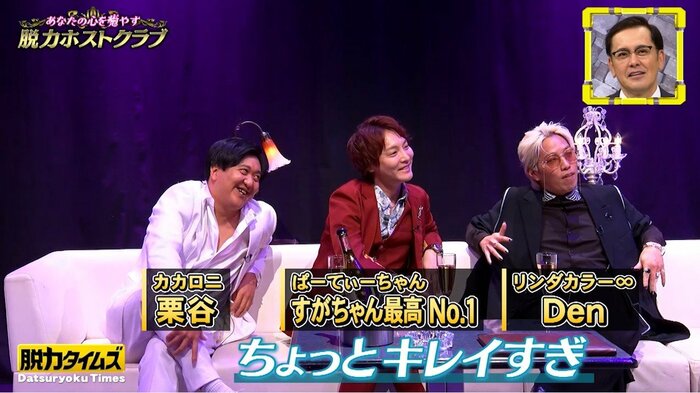 Den(リンダカラー∞)さん、すがちゃん最高No.1(ぱーてぃーちゃん)さん、栗谷(カカロニ)さんによる、カリスマホスト3人衆が迎えました。