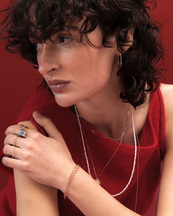 繊細に光り輝く[eclat lace]シリーズ。一つ一つ手作業で仕上げられたジュエリーは、職人の高度な技術が光ります。レース模様のようなデザインは光が当たるたび繊細にきらめき洗練されたスタイルに。チェーンで形作られたジュエリーは柔らかな手触りで素肌にぴったりと馴染みます。