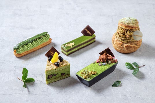 写真左上より時計回り:抹茶エクレア、抹茶オペラ、抹茶とピスタチオのシュークリーム、抹茶の枯山水ティラミス、抹茶のバタークリームケーキ