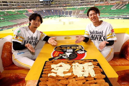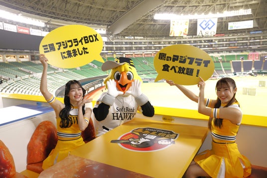 3月3日(火)に、みずほPayPayドーム福岡の新観戦シート「三陽 アジフライBOX」をお披露目しました。“アジフライをモチーフにしたBOX型観戦席”というインパクトある空間演出と、観戦特典の「鷹のアジフライ」食べ放題の魅力を、上沢直之投手、木村光投手とともにご紹介しました。