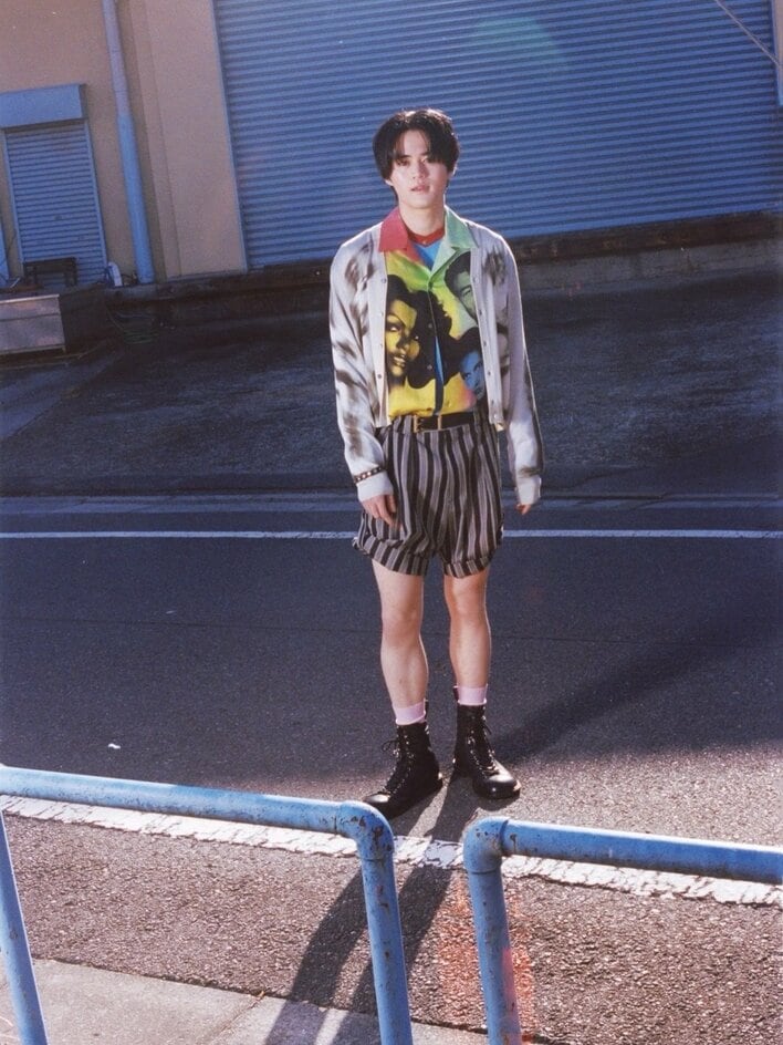 黄色や青、緑などカラフルな色合いのグラフィックシャツに、カーディガンを重ねた鈴鹿さん。ボトムスは、ストライプ柄の膝上パンツにブーツを合わせたコーディネートを披露。