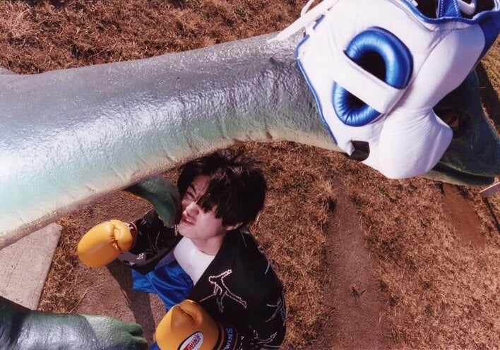 黄色のボクシンググローブを両手にはめて、ファイティングポーズをとっていたようですが、恐竜にやられてしまった様子。ゆがんだ表情を浮かべています…。