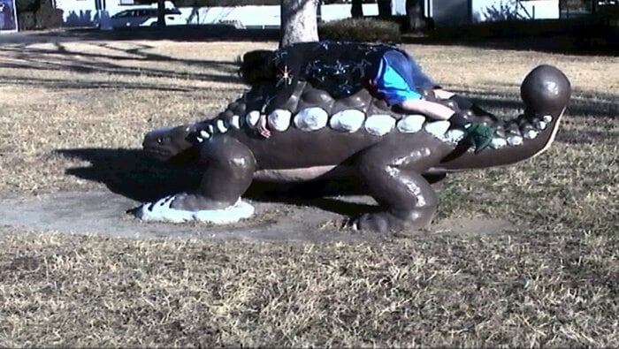 最後は小さめの恐竜の背中に、だらんとうつぶせで寝転んでしまいました。
