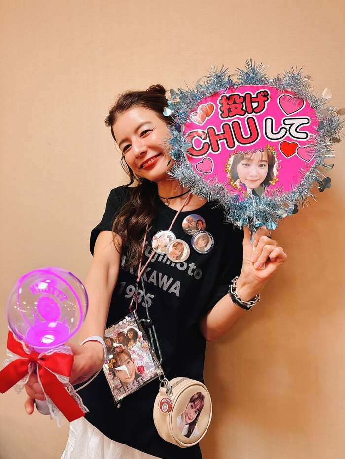 うちわには銀色のテープで縁取りがされ、「投げ CHUして」というメッセージとハートのイラストと共に藤本さんの顔写真が貼られています。ピンク色に光るペンライトを手に持ち、胸元にはたくさんのピンバッジ。イベントを心から楽しんでいる様子が伝わってくる、明るい笑顔が印象的です。