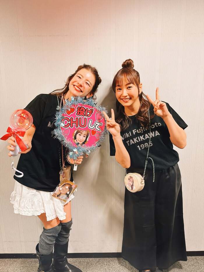 大きなうちわを手に“ファンモード全開”のスザンヌさんの隣で、藤本さんは笑顔のダブルピース。二人の仲の良さが伝わってくる、ほほ笑ましい一枚となっています。