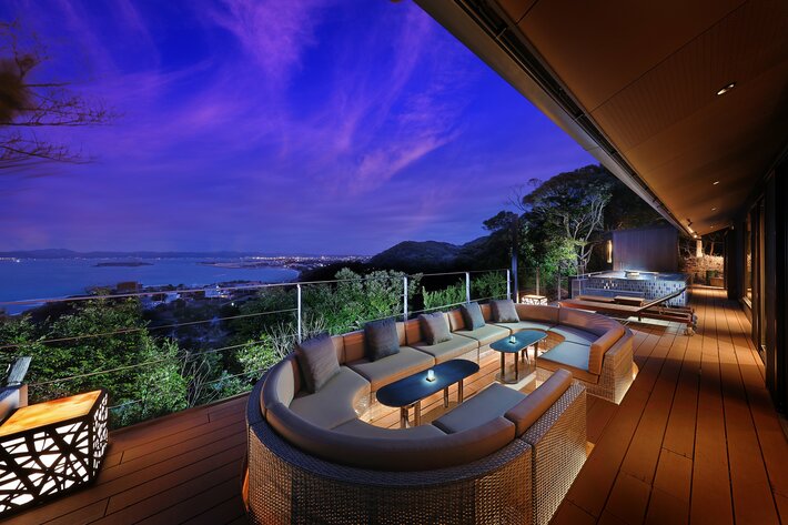 昼は青い海と空、夜は星と夜景に包まれる、唯一無二の寛ぎの舞台です。