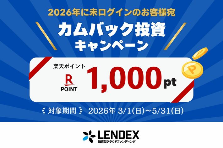この度、融資型クラウドファンディング「レンデックス(LENDEX)」を運営する株式会社LENDEX(本社:東京都渋谷区、代表取締役:中村 智)は、【カムバックキャンペーン】を2026年3月に開始したことをお知らせします。