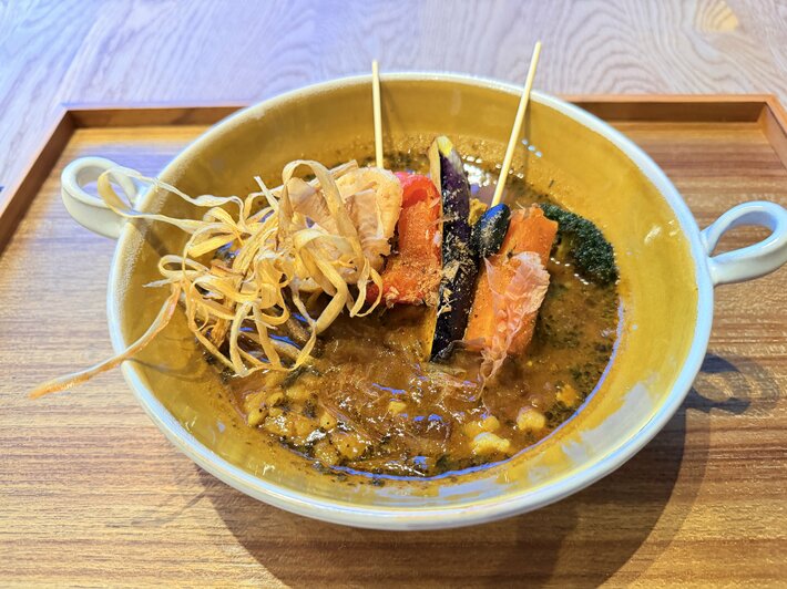 全メニュー共通のベーススープは、鶏ガラと香味野菜を圧力鍋で煮込んで作る。10種類以上のスパイスと丹波篠山名物のぼたん鍋の味噌を調合した「味噌玉」を加え、提供前にカレーの種類ごとにスパイスをテンパリング(油でスパイスの香りを引き出す調理法)して仕上げる。辛みはゼロから調整可能で、辛いものが苦手な方でも楽しめる。