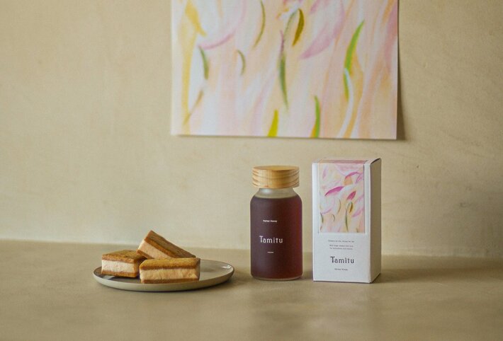 「暮らしに花を、わたしに蜜を。」をコンセプトに、創業100余年の養蜂園が次の時代へ提案する新しいはちみつのカタチ「Tamitu」。メインプロダクトであるHerbal Honeyは冷たいものに溶けやすく、そのままはもちろん、炭酸水などのドリンクで割ってお楽しみいただけます。2021年に誕生し、2022年7月には実店舗「Tamitu Laboratory & cafe」が東京・表参道に第一号店としてオープン。そこではHerbal Honeyを五感で体験していただくため、ショップの他に、カフェやLabo(調合室)が併設されています。