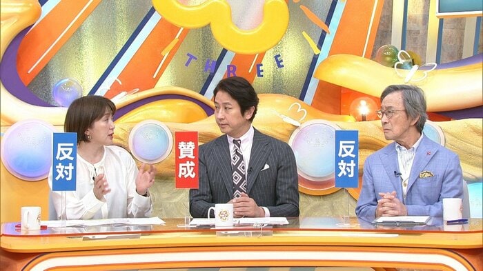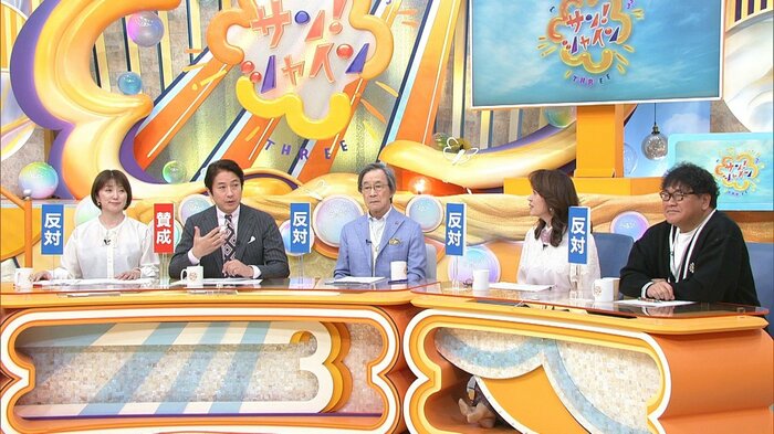 一人だけ「賛成」の札を上げた谷原キャスターは…。