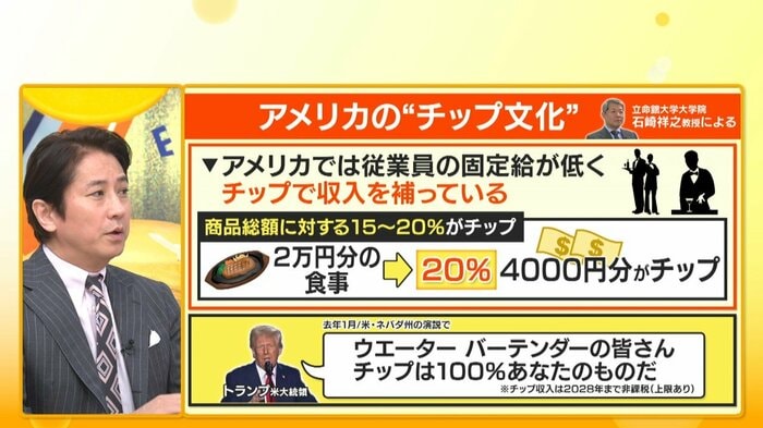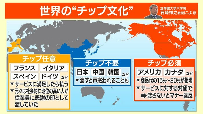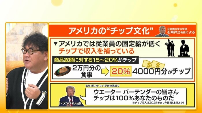 アメリカとかの仕組みは、最低賃金は安いけどチップでもうかりますよ、その代わりチップを払わなくてはいけないという決まりがある。
