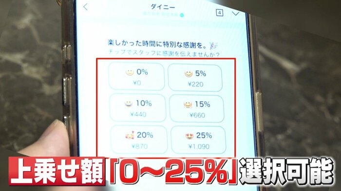 上乗せする割合は、0%から25%まで選択可能。客側は、自分の受けたサービスの満足度に合った額を支払うことができます。