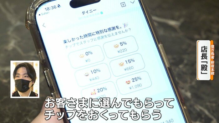 東京・新宿区にある居酒屋「億万鳥者 新宿本殿」では、モバイルオーダーを使って、会計額にチップを“上乗せ”できるサービスを開始しました。