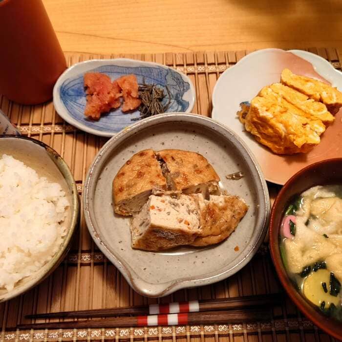 投稿された写真には、見るからに温まりそうな和食の膳が写し出されています。竹製の敷物の上には、つやつやと炊き上がった白ご飯や、油揚げなど具沢山のお味噌汁。そして彩り豊かなおかずが並びます。