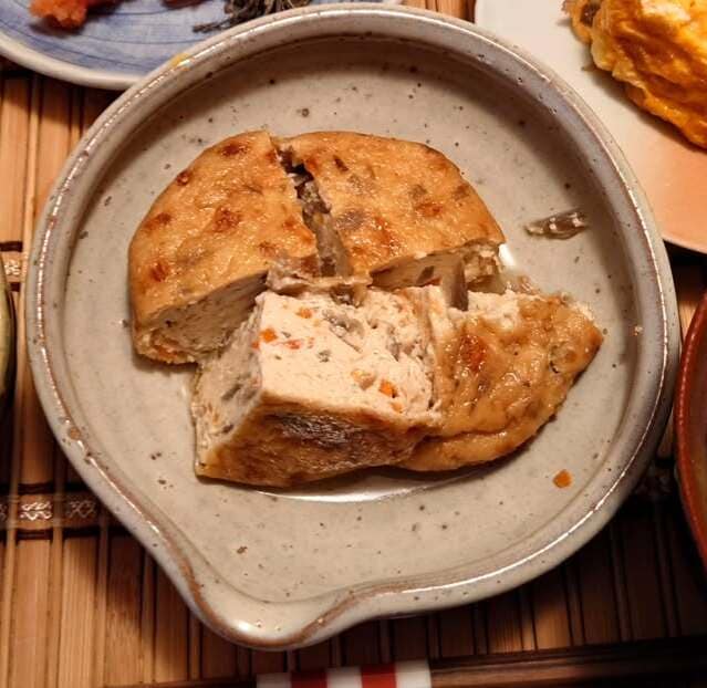中央の灰色の器には、大きながんもが4つに切り分けられて盛り付けられています。今にもジュワッと出汁があふれ出しそうな一品で、ヘルシーでありながら食べ応えも感じられそうです。