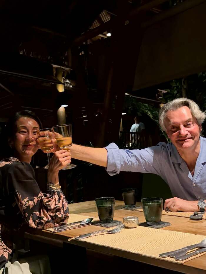 グラスを持って幸せそうな笑顔を浮かべる中村さんの顔の近くにまで、夫は手を伸ばしてグラスを持っていて、なんとも無邪気です。