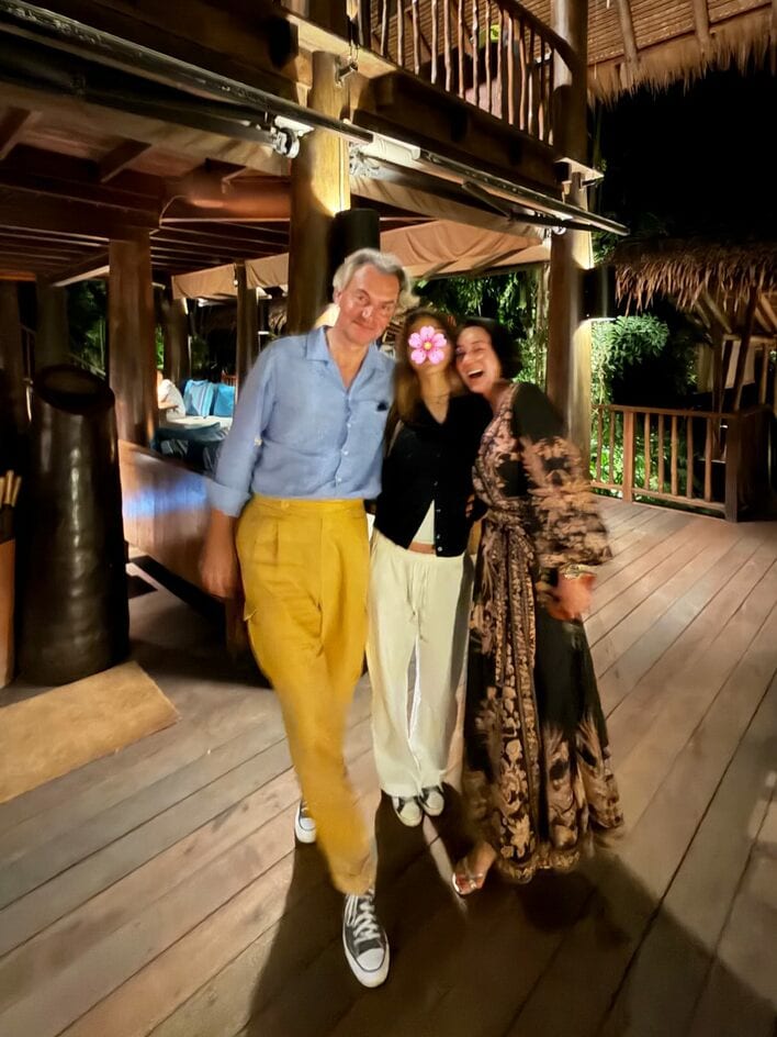 また、ディナータイムの時でしょうか、バカンスあふれる木材の建物で家族写真をパシャリ!