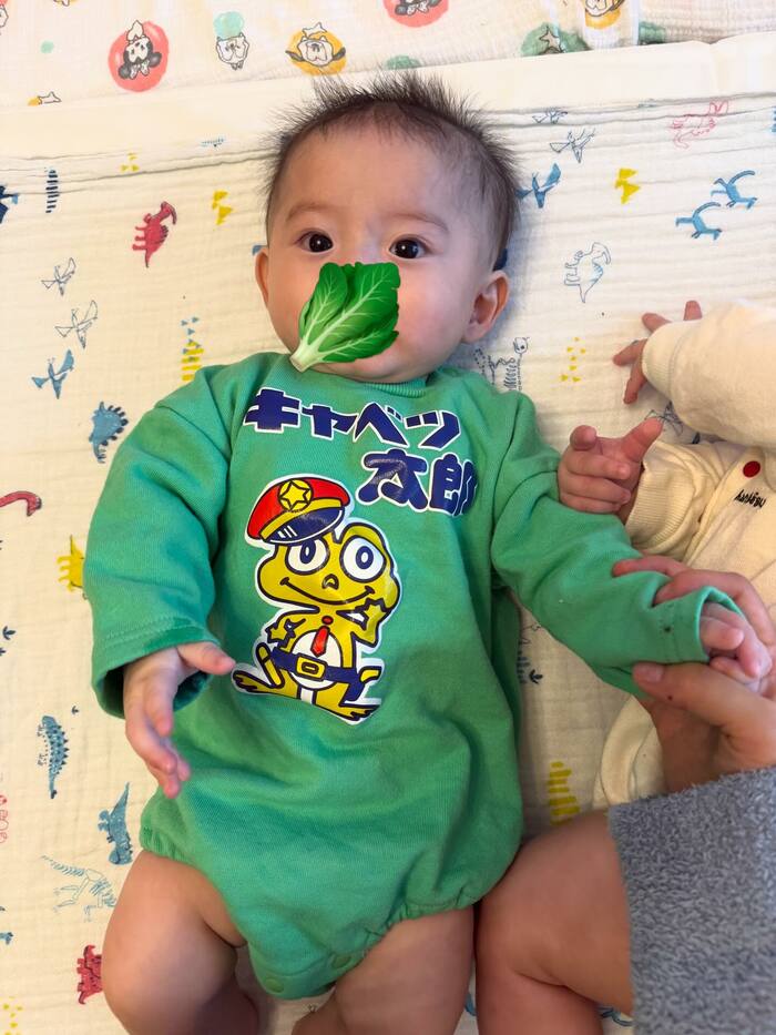 さらに、新しいロンパースをゲットしたそうで、お兄ちゃんは首元がハンバーグになった「ハンバーグ寿司」。一方の弟くんはお菓子の「キャベツ太郎」がメインにデザインされたものでした。